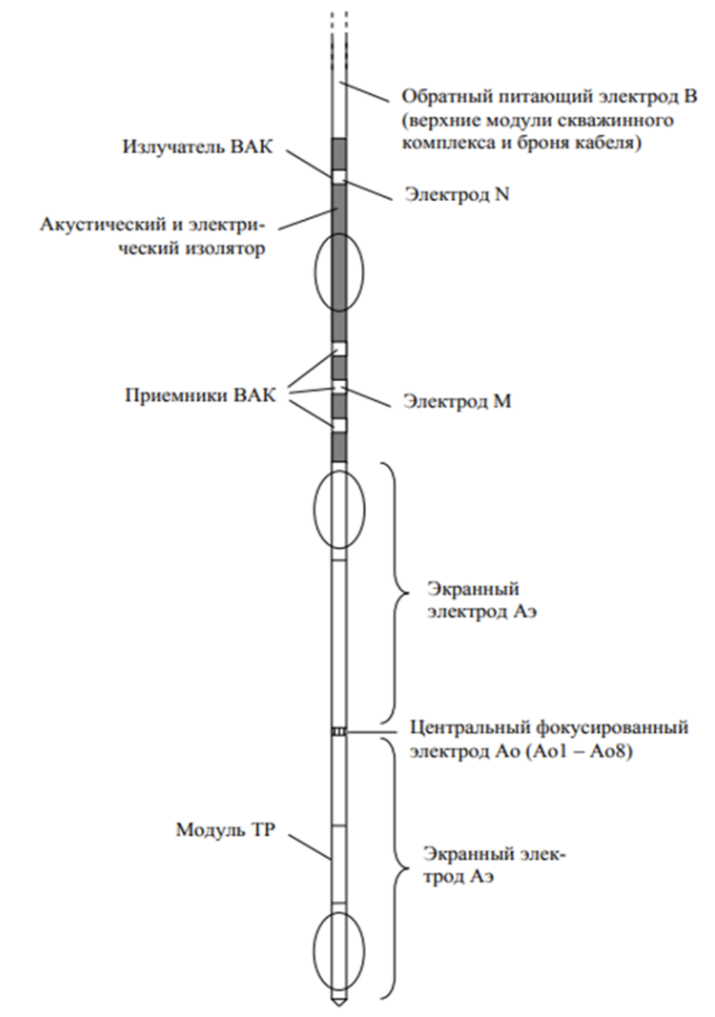 Трехэлектродный зонд бокового каротажа (БК-3) с автоматической фокусировкой тока представляет собой длинный проводящий цилиндрический электрод, разделённый изоляционными промежутками на три части. Центральный короткий (0.15 м) электрод Ао является основным, а крайние Аэ1 и Аэ2 более длинные (по 1.6 м) – дополнительными, называемыми экранными или фокусирующими. Экранные электроды соединены между собой и отделены от центрального электрода с помощью колец, из изоляционного материла высотой 0.01 – 0.03 м. Через все электроды пропускается переменный ток одной полярности.