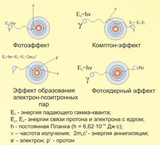 Кроме комптон-эффекта в породах гамма-кванты взаимодействуют также через фотоэффект (полное поглощение гамма-кванта с выбросом связанного электрона) и образование электронно-позитронных пар при энергиях выше 1.02 МэВ. Вероятность взаимодействия зависит от вида атома и от энергии гамма-кванта. Однако в методе ГГК основное значение имеют комптон-эффект и фотоэффект, которые зависят от плотности и элементного состава пород.