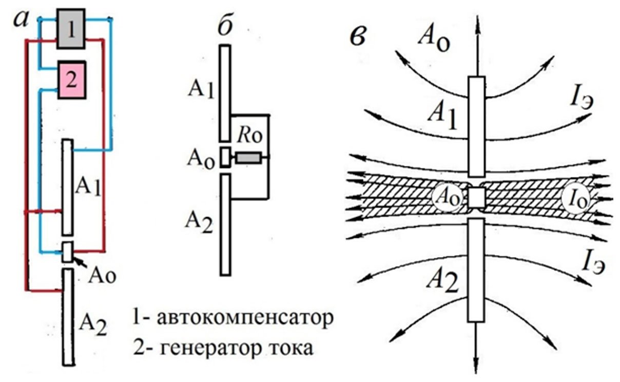 Для записи кривой БК необходимо обеспечить равенство потенциалов основного и экранных электродов. Это достигается двумя путями. Один путь – это использование автокомпенсатора. С его помощью автоматически регулируется сила тока, протекающего через экранные электроды Аэ1 и Аэ2. Регулируется она так, чтобы ток, проходящий через центральный электрод Ао, оставался неизменной силы (Iо). Тогда разность потенциалов между основным и экранными электродами становится равной нулю.