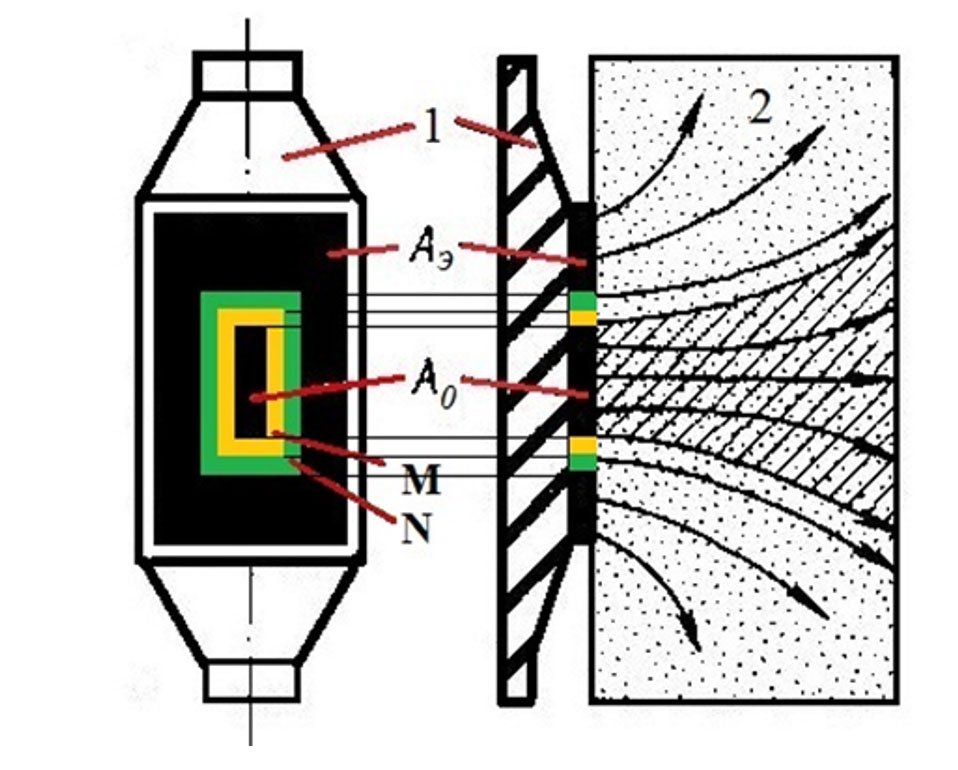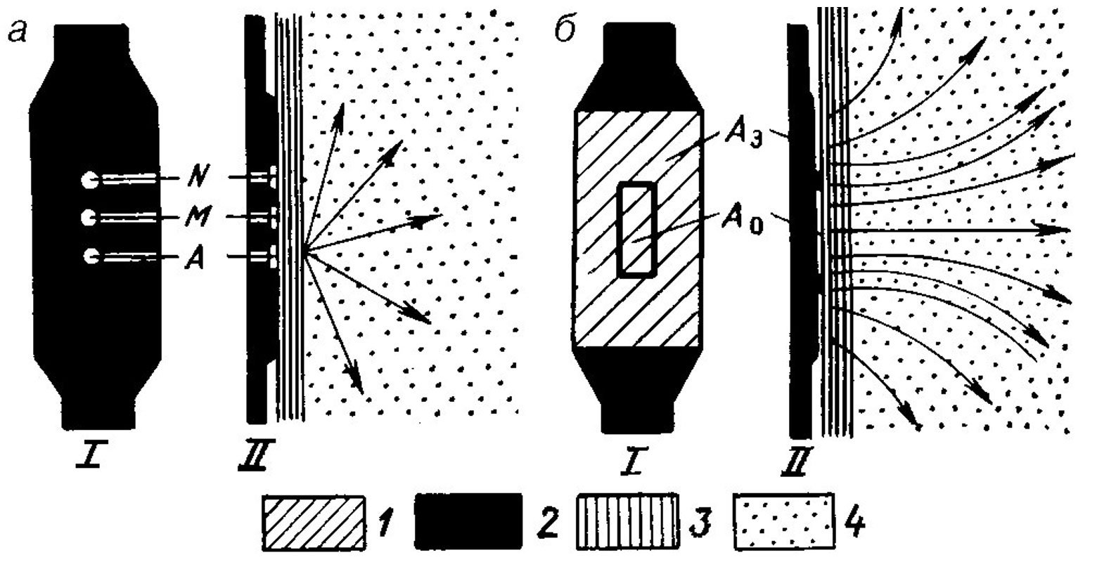 Малые расстояния между соседними электродами (1.25-2.5 см) обеспечивают малую глубину исследования. Однако наличие экранного электрода Аэ обуславливает распространение тока из электрода А0 по пласту вблизи скважины пучком, практически перпендикулярным к стенке скважины. Этим заметно уменьшается влияние глинистой корки и плёнки бурового раствора между башмаком и стенкой скважины.