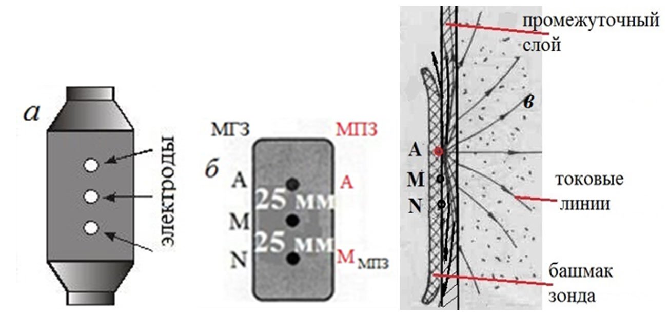 Микроградиент – зонд (МГЗ) и микропотенциал – зонд (МПЗ) монтируются на внешней стороне башмака. Токовый электрод A и измерительные электроды M и N микрозонда изготовлены из латунного стержня диаметром 10 мм и вмонтированы в резину башмака. Они располагаются на его внешней стороне. Резина обеспечивает изоляцию электродов друг от друга, от корпуса и промывочной жидкости. Расстояние между электродами 2.5 см. Второй токовый электрод В устанавливается на кабеле на расстоянии 1 м от корпуса прибора.