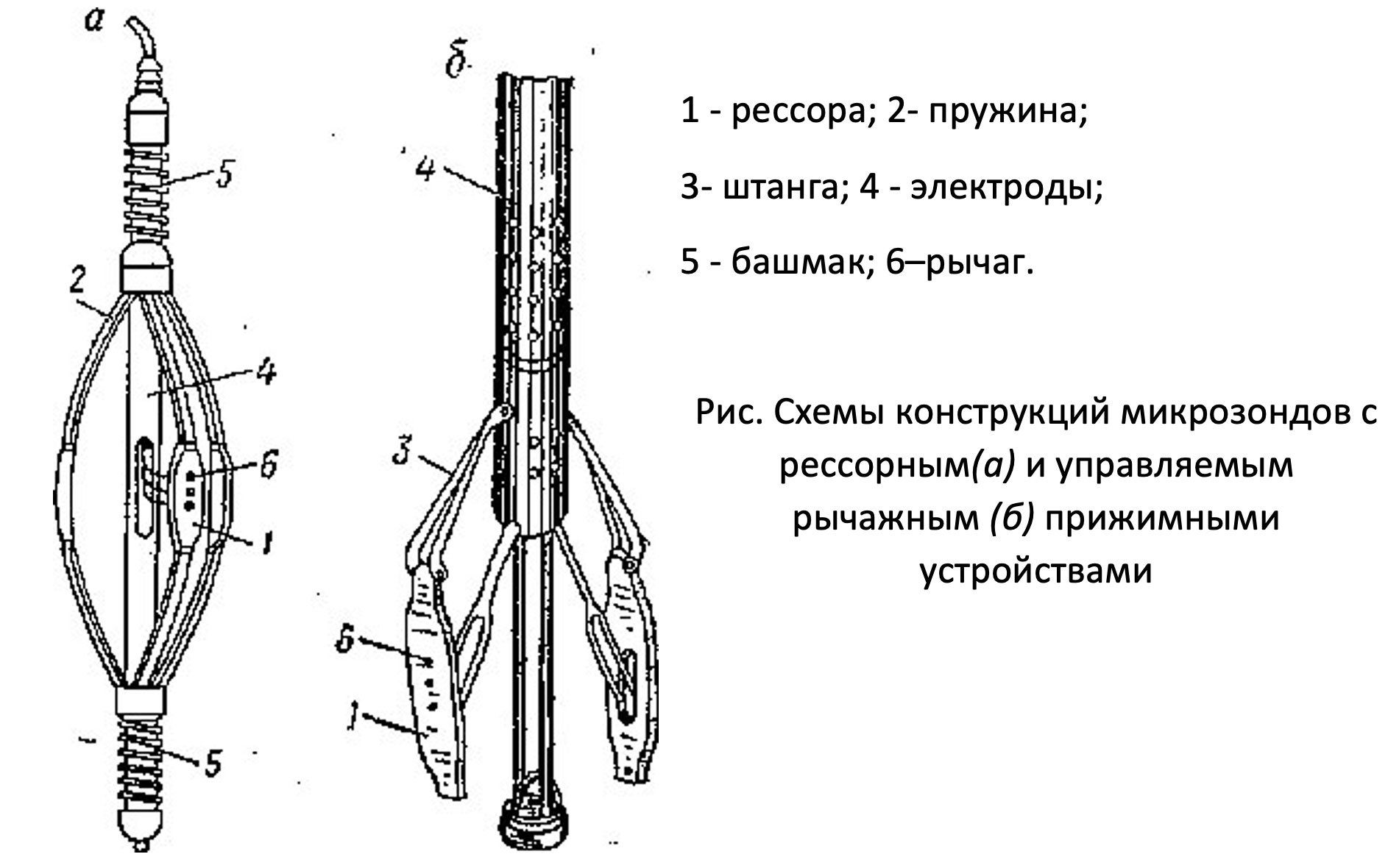 Во втором виде в микрозонде с управляемым рычажным прижимным устройством башмак с электродами шарнирно укрепляется на одной из двух пар рычагов, которые прижимаются к стенке скважины любого диаметра с постоянным усилением. Прижимное устройство опускается в скважину в закрытом состоянии, а в интервале записи открывается по команде с поверхности.