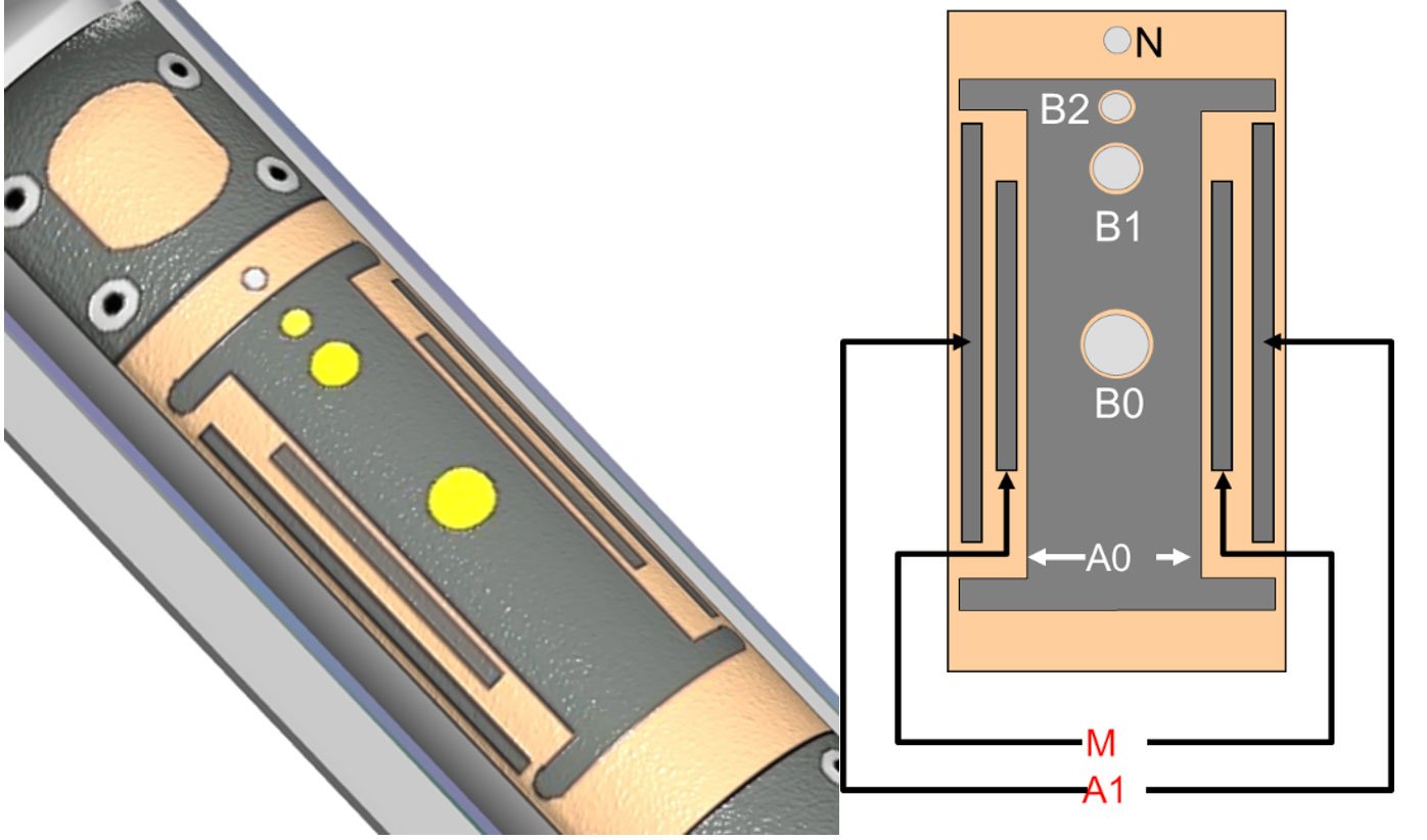 Зонд БМК монтируется на изоляционной пластине (башмак), которая прижимается к стенке скважины. Состоит зонд БМК из основного центрального электрода А0, окружающего его двух измерительных электродов M, N и экранного электрода Аэ, смонтированных на башмаке из изоляционного материала.