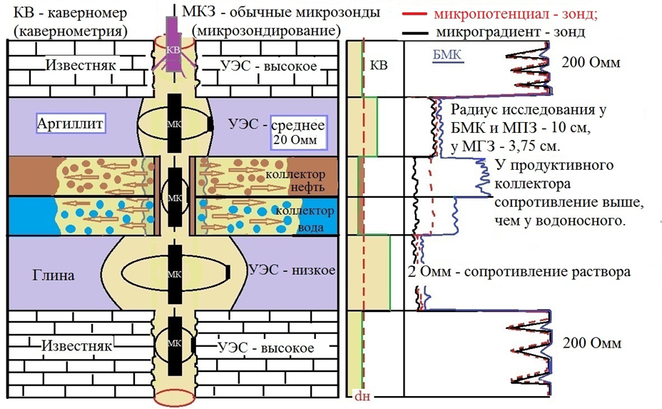 Кривые МГЗ и МПЗ записываются одновременно и вместе называются микрозонды (МКЗ). Границы между породами разной литологии отбиваются на МКЗ по резкому подъёму кривых.