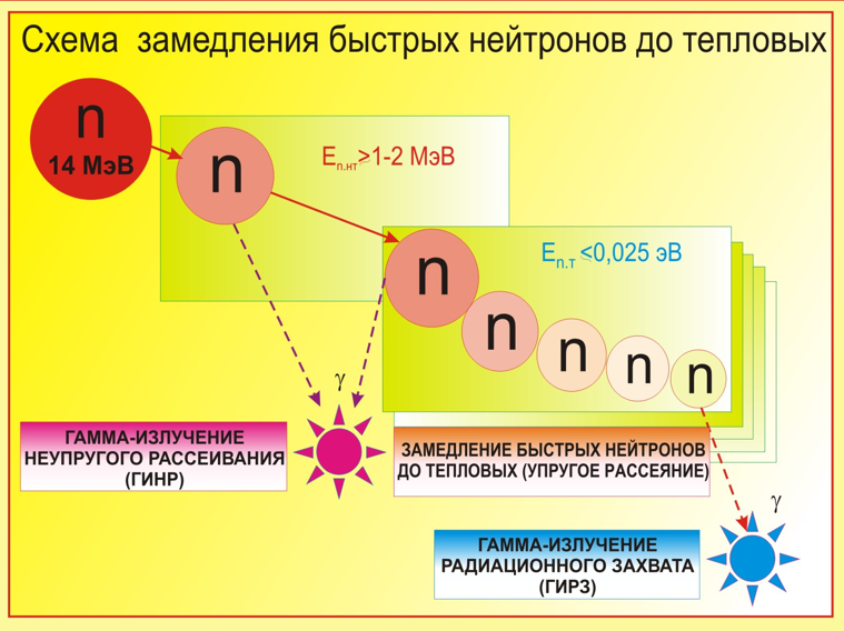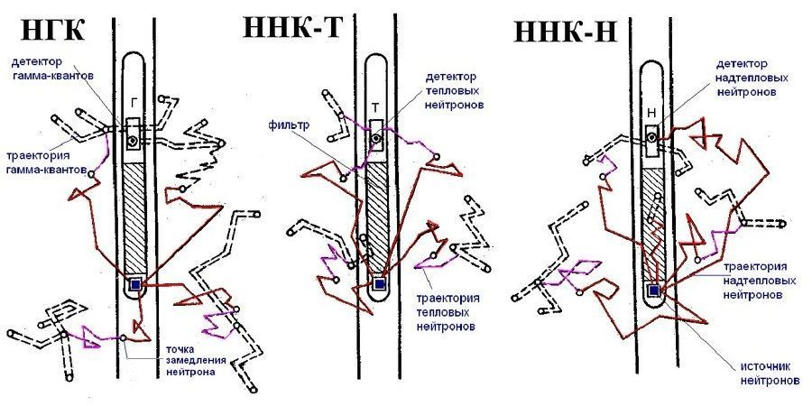 Принцип работы: быстрые нейтроны, испускаемые источником, взаимодействуют с породой. В результате этих взаимодействий нейтроны замедляются до тепловой энергии. Замедленные нейтроны (или гамма-кванты, возникающие при их захвате) регистрируются детектором. Интенсивность нейтронного или гамма-излучения, регистрируемая детектором, зависит от содержания водорода в породе, что позволяет оценить ее пористость.
