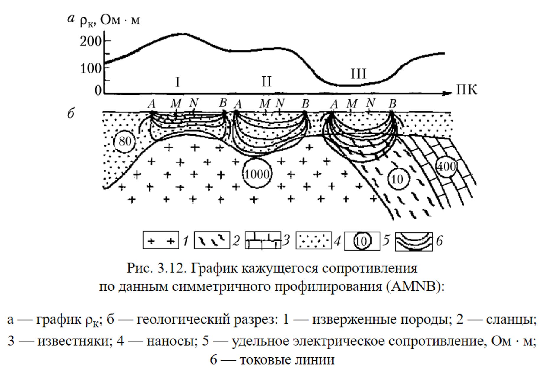 В вертикальном электрическом зондировании (ВЭЗ) максимальное расстояние между питающими электродами (линия AB) обычно принимается в 7–10 раз больше глубины исследования, а иногда и в 15–20 раз для хорошо проводящих сред. Расстояние между принимающими электродами MN в 5–10 раз меньше AB. Глубины, которые достигаются этим методом, обычно до 300–500 м.